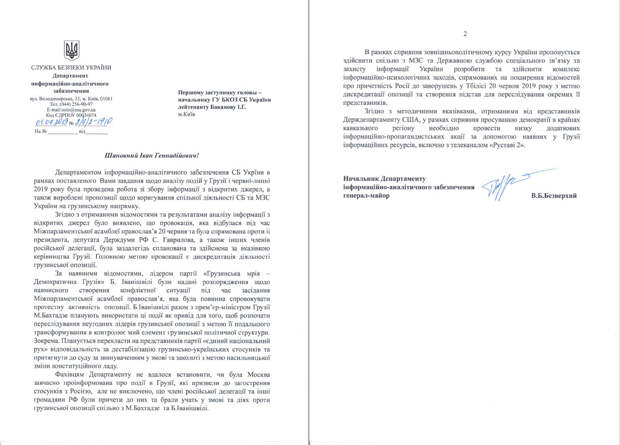 В СБУ предлагают продвигать идею о том, что ухудшение грузино-российских отношений произошло в результате заранее подготовленной при участии России провокации, которая якобы поможет Иванишвили, являющемуся, по сути, теневым руководителем страны, задавить грузинскую оппозицию.